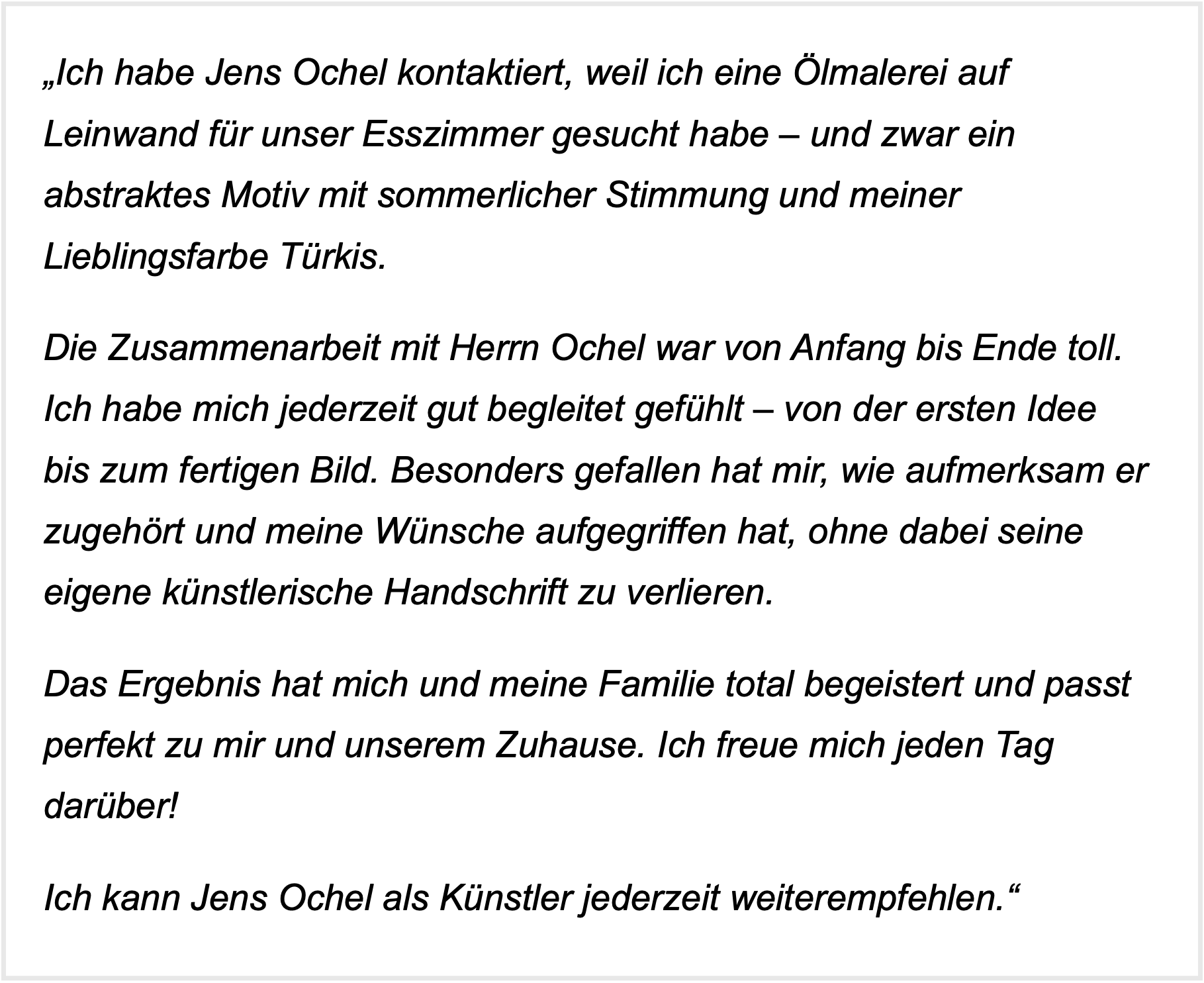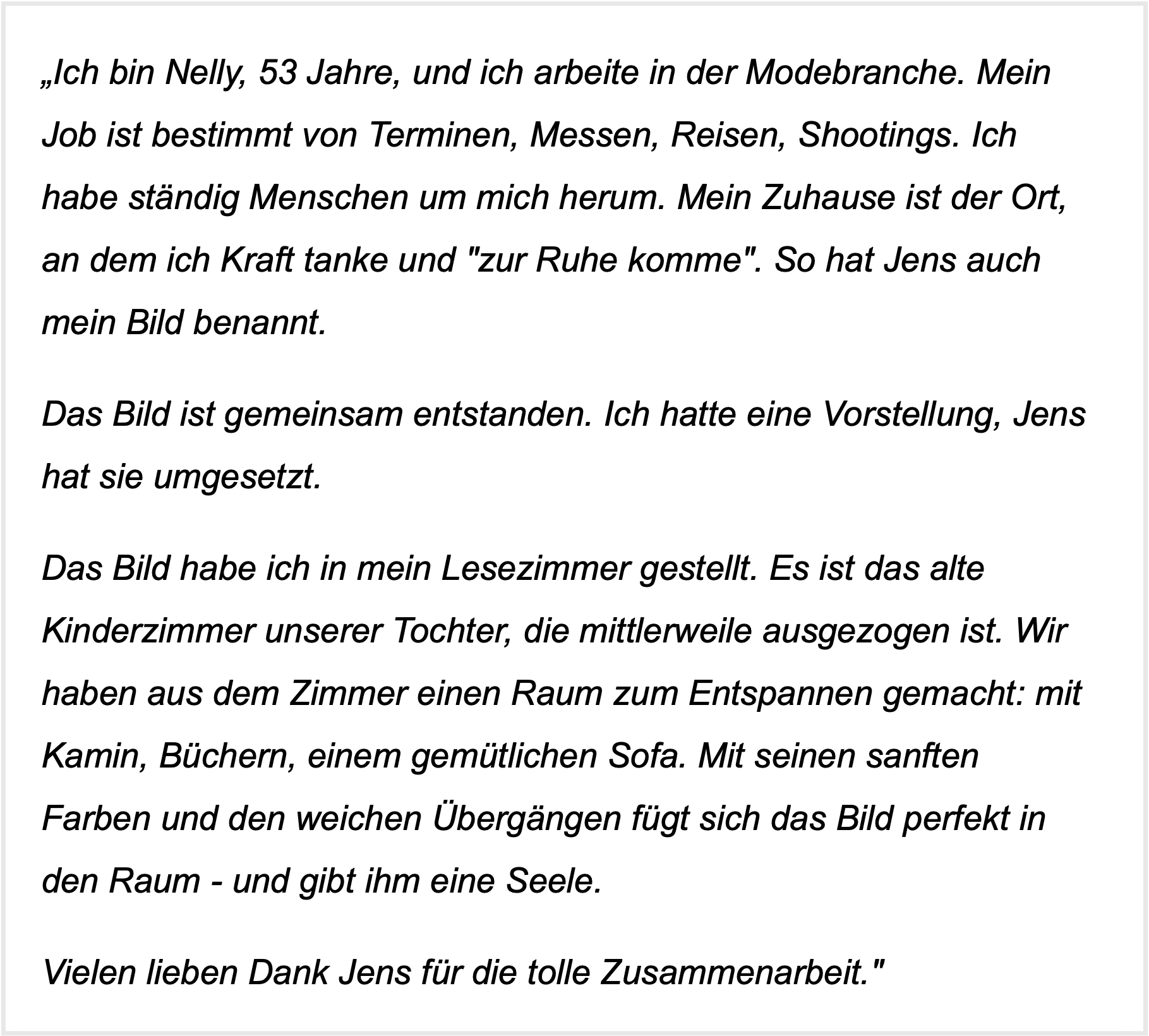 Haben Sie den Wunsch, ein abstraktes Bild nach Ihren persönlichen Vorstellungen malen bzw. interpretieren zu lassen? Gerne erkläre ich Ihnen meine Vorgehensweise hierbei. Bereits zahlreiche Kundinnen und Kunden haben sich von mir ein individuelles abstraktes Bild malen lassen. In den folgenden beiden digitalen Präsentationen erhalten Sie Informationen zu meiner Auftragsmalerei für Privatpersonen bzw. Unternehmen: