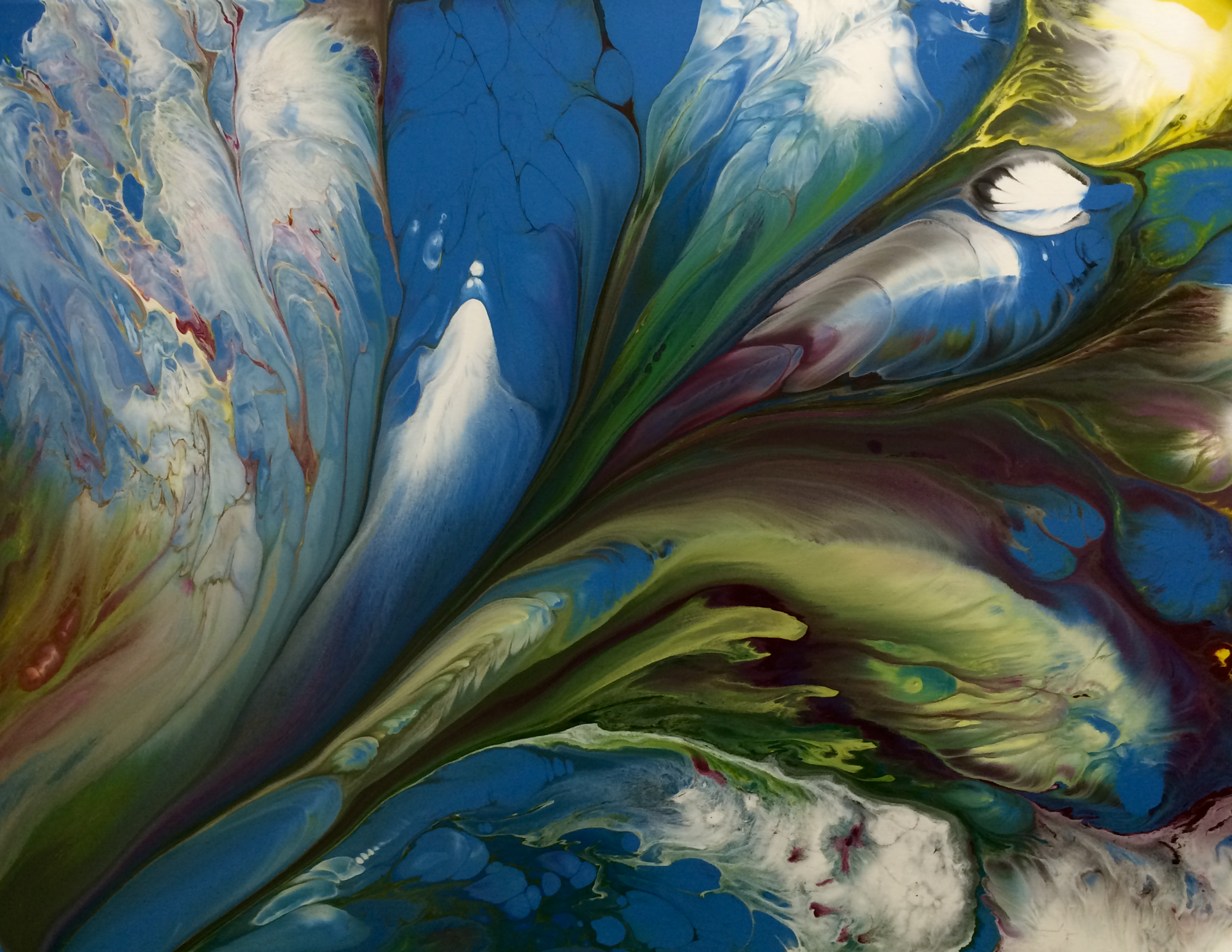 Als Künstler agiere ich im Spannungsfeld zwischen Zufall und Steuerung, Kontrolle und Loslassen: Ich setze während des gesamten Mal- und Trockenprozesses immer wieder gezielte Impulse (u.a. mit dem Pinsel) und verändere damit den Prozess und die Komposition bis zum Schluß. Das Bild nimmt meine künstlerischen Akzente auf. Die Schwerkraft steuert die Strömung der Farben. Jeder Moment ist instabil - so entsteht etwas sinnbildlich Unfassbares.